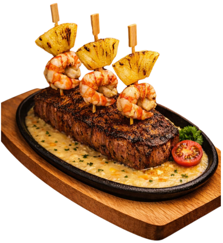 gegrilltes Entrecote an pikanter, karibischer Gemüserahmsauce, gespickt mit gegrillten Ananas-Krevetten-Spiessli