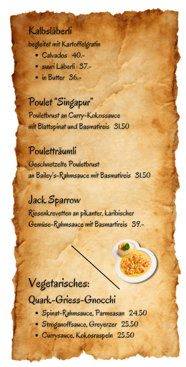 200g (Zweimaster) 300g (Dreimaster) 400g (Viermaster) Pferd 45.- / 54.- / 63.- Rind 52.- / 61.- / 70.- Beilage nach Wunsch