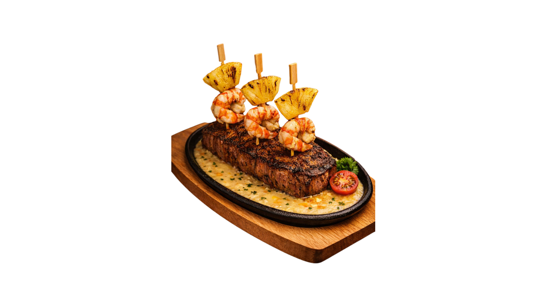gegrilltes Entrecote an pikanter, karibischer Gemüserahmsauce, gespickt mit gegrillten Ananas-Krevetten-Spiessli
