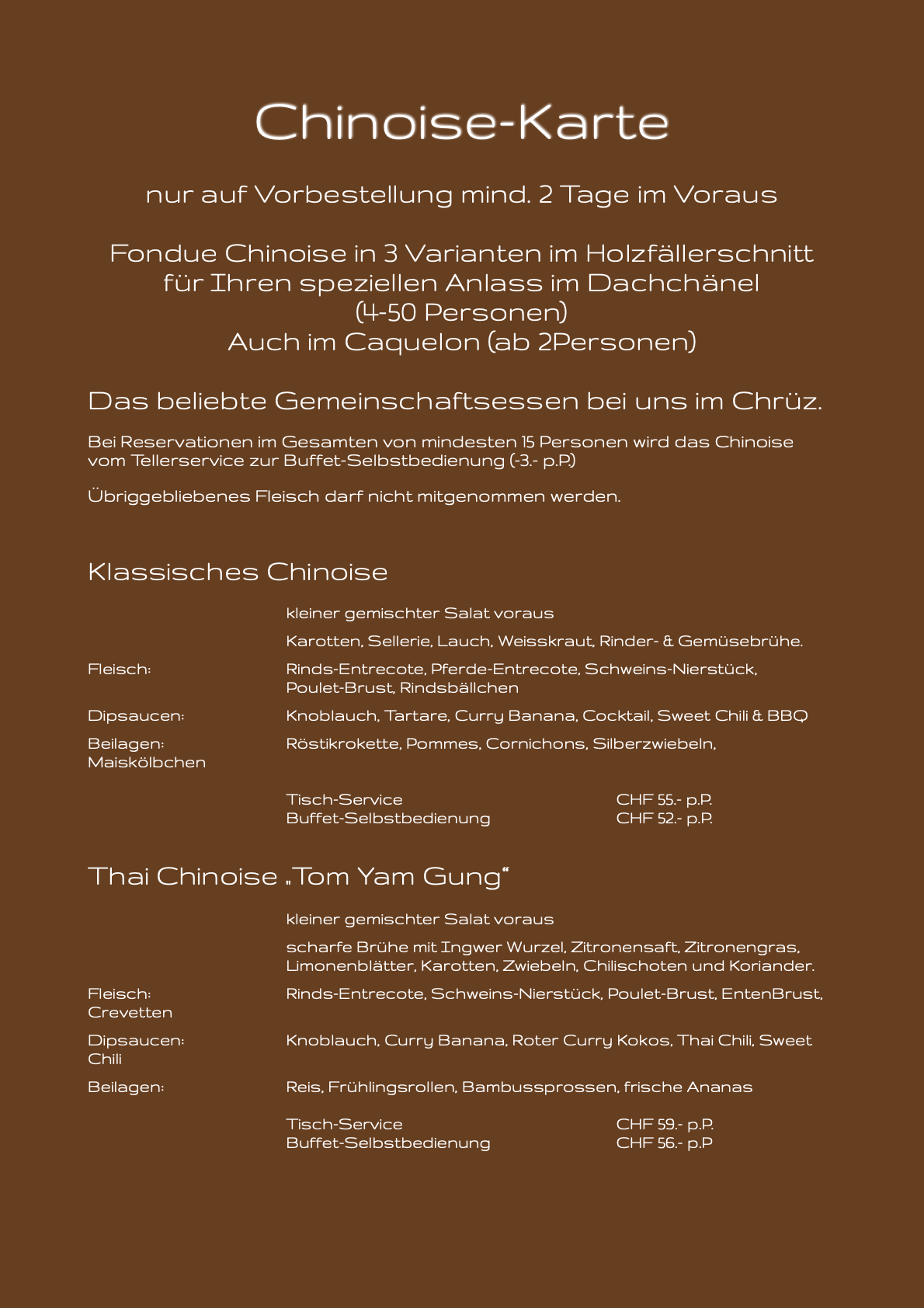 Das beliebte Gemeinschaftsessen bei uns im Chrüz. Sobald Reservationen im Gesamten von mindesten 15 Personen vorliegen, wird das Chinoise vom Tellerservice zur Buffet-Selbstbedienung.
