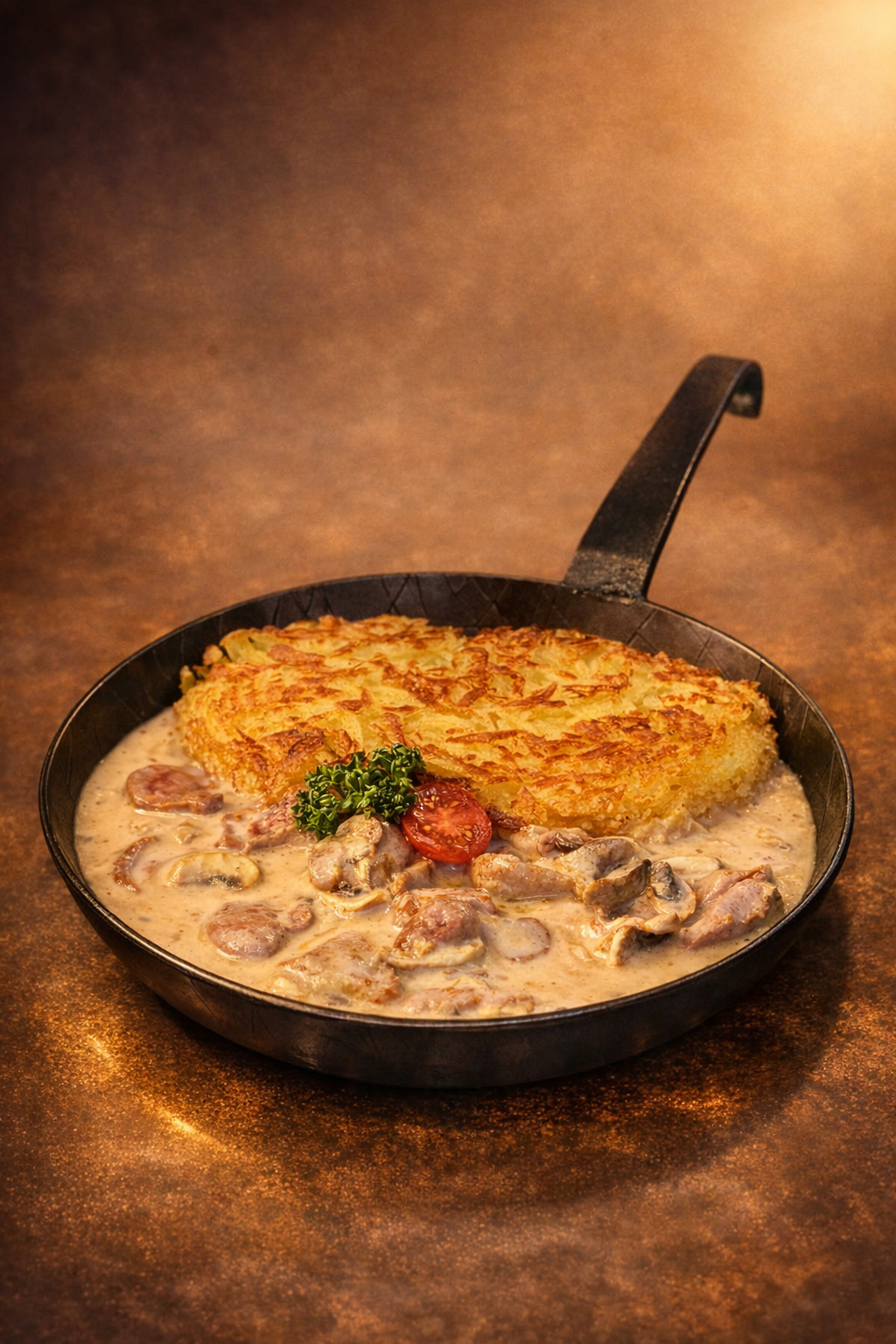 Rösti-Sonntag Nur auf Vorbestellung - mindestens ein Tag im Voraus mit Kalbsnuss und Kalbsnierli (oder ohne Nierli) 39.- Original Zürcher Geschnetzeltes Röstipfanne Speck, Raclette, Champignons, Zwiebel 25.- Rösti als Beilage können Sonntags zu allen Fleischgerichten bestellt werden (+2.-)